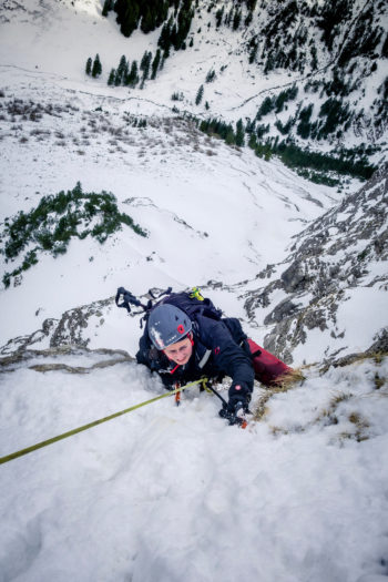 Pitch after pitch we started to gain height, the view down became more and more spectacular, the joy of just being here rising exponentially. After some quite tricky pitches, the summit snowfield slowly came into view: Usually a large white area, this time interspersed with pines and rocks. Yes, we simply had incredibly little snow this year. But the unusually warm temperatures put the top part of the face into prime conditions and plodding up it was a real pleasure.